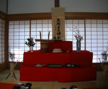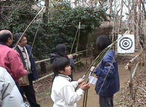 | 【年頭に行われる弓神事。各戸の世帯主がムラの氏神や小祠に集まり、神事の後、決められた人、あるいは参加者全員で弓を射る。】 オビシャは、主として関東地方の各村落で行われる春の行事です。なかでも千葉県北・中部はオビシャ行事が最も盛んに行われる地域の一つです。いずれも年の始めの1月から2月にかけて行うところが多く、元来は弓を射てその年1年の作物の作柄など、神意を占う予祝行事であったと思われます。 |