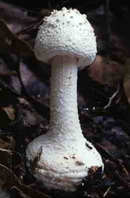 | Amanita abrupta ハラタケ目,テングタケ科, テングタケ属 プロフィール:小形のシロオニタケという風情であるが,柄の基部が図にみられるように大きく膨大する点が著しい特徴である.和名は玉白鬼茸の意味. 見分け方:柄の基部がカブラ状からタマネギ状に突然膨大する. 発生時期と生態:県内では清澄山周辺の常緑ガシやコナラの林に10月頃発生する.1969年に日本特産のきのことして発表されたが,前世紀に北米東部に産するきのことして記載さていることが判明した.日本と北米東部に分布する. 中毒のタイプ:A致命的な毒. |