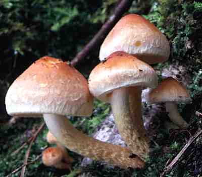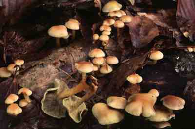 | Naematoloma fasciculare ハラタケ目 モエギタケ科 クリタケ属 プロフィール : 傘の色は硫黄色ともいうべき鮮やかな黄色の美しいきのこ.しかし,こんな美しいきのこも毒成分を持つのである. |