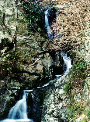 この滝が、面滝複合型副滝掘出し溝型に変化し、さらに、副滝が更に発達して、曲がり滝となって、主滝に水が来なくなって面滝より線滝に変化した状態と解される。今後は旧主滝の岸壁の風化による消滅と、最上段の面滝化が進むであろう。