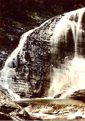 <写真提供 君島安正氏> 天神山は旧天神山村の意味。今では使う人も少ない地名であり、梨沢不動滝と呼ぶのがふさわしいかも。 梨沢の大滝ともいう。 所在地:富津市梨沢 梨沢東又 水系:湊川支流梨沢 落差:6m 成因:本流型の滝。 地層:三浦層群天津層砂岩泥岩互層。逆層。 稿本千葉県誌『天神山不動滝 君津郡天神山村大字梨澤東南の山間に在り、七竃の池の流末懸りて高さ二丈許の瀑布となる、早魃の際村民の雨を祈る所とす。』 滝面:面滝複合型、主滝壁状急傾斜。円弧状副滝直下型。 左岸の滝崖に不動像がまつられている。