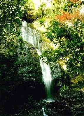 | 外野不動滝 平久里川水系。 落差23m。 懸谷型の滝。 外野の瀑布帯に落下する支流の滝 佐久間層群10〜30cmの泥岩。 滝面:面滝壁状、二段。後退量は少ない。 この滝の上に上滝1、2があるが、上滝2は道路により改変。 | ![]() |