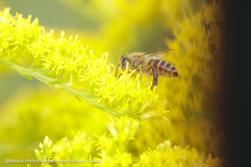 君津市にて。道路沿いに黄色い花を咲かせたセイタカアワダチソウに5匹ほどが飛来していた。どこに巣があるのだろうか。