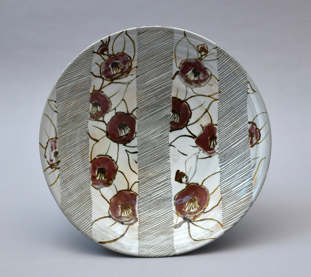 千葉市を拠点に活動をする神谷紀雄は、酸化鉄の文様と銅彩の焼成による彩色表現を行う「鉄絵銅彩」の技法で、身近にある植物を題材にした、彩り豊かな陶芸作品を創 出します。神谷は益子焼窯元の家に生まれ、多摩美術大学で彫刻を学んだ後、人間国宝・田村耕一氏に師事し、日本伝統工芸展を中心に出品を重ねて、陶芸の道を進みま す。千葉市に窯を築き、益子の土も使いながら、素材や技法にこだわった作陶を続けて、県内最大の公募展・千葉県美術展覧会(県展)にも毎年作品を発表し、現在では展 覧会を運営する千葉県美術会の会長を務めるほか、県内の工芸作家を集めた伝統工芸陶葉会を主宰するなど、県内の美術活動の振興にも精力的に携わっています。
