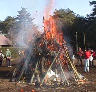 | 【小正月の火祭り行事。正月飾りの処理を行うと共に、正月の神送りとして考えられることが多い。】 正月14日や15日に、門松やお飾りを燃やす行事は、千葉県内各地にみられます。これらの行事は地域によってそれぞれ、ドンド焼き(長生郡長柄町など)、大火焚き(安房郡三芳村山名など)、お飾り焚き(市原市菊間など)、上り正月(銚子市名洗など)などとよばれています。 いずれにしても無病息災や家内安全をいのるものですが、地域の人々が集まって行われたり、あるいは各家々で行われたり、また、燃やすものや、謂われなどにもそれぞれちょっとしたちがいがみられます。この行事は、いずれも平安時代よりの宮中の火祭り行事に由来するといわれ、火の力により、無病息災、学力増進などを願う行事として、現在でも全国的に行われています。 |