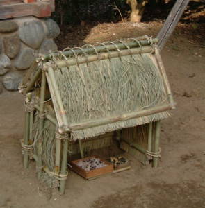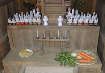 | 【五穀豊穣、招福、商売繁盛などを祈願する稲荷神の祭祀。神前に幟を立て赤飯、餅などを供える。日本各地で様々な祭祀の方法がある。】 陽射しに春を感じ、ようやく農作業も始まろうという旧暦の二月最初の午の日に、お稲荷様のおまつりが行われます。この日に稲荷神の祭りを行ういわれは、『山城国風土記』逸文に、和銅4年(711)2月7日初午の日に、稲荷神が稲荷山三ケ峰に鎮座したと書かれている故事によります。 もともと農耕の神であった稲荷神は、町場でも商売繁盛、病気平癒などに御利益があるとされて広く信仰を集めました。初午は子供が中心の行事でした。前日のヨミヤ(宵宮)に子供たちが、先っぽにだけ葉を残した篠竹などに「稲荷」と手で刷って作られた旗を売り歩いて小遣いにしたり、太鼓を叩いたり歌を歌って楽しく過ごしました。 |