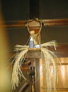 | 【稲作儀礼の一つで稲刈りの終わりを祝う収穫行事。新穀の餅に大根、特に二股大根を添えて供えたり、あるいは稲刈り鎌を供える。】 今の農業では、稲刈りをしたあと、脱穀、袋づめといったいくつかの作業が続いて行われます。つまり、稲刈りは一連の作業の中途にすぎません。これに対して、古くは稲を田でほした後、すぐには脱穀せず、穂のついたままで倉や納屋などに保存しておく期間があったのです。農家の人達は稲刈りがおわるとほっと一区切りという感じをもった事でしょう。ですから稲刈りの後には盛大なお祝いがなされたのです。 |