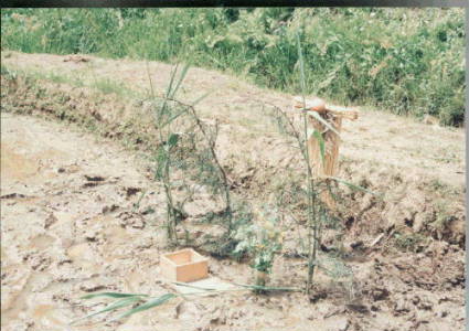 | 【稲作儀礼の一つで、種籾を苗代に蒔いたときに行う。苗代田の水口、畦、中央などに木の枝、季節の花、削り掛けなどをさし、焼米、洗米などを供え、稲の発芽、成長を祈る。】 江戸時代の元禄期に出された『農業全書』(宮崎安貞著)の巻之二「五穀之類」の稲に関する記述の冒頭には、「稲は五穀の中で極めて貴い作物です。稲は太陰の精であり、水を含んでその穂をさかんにするといわれているように、水によって生長するのですから、土地の善し悪しはそれほど問題ではなく、まず水のことを考えるべきです。」という内容が書かれています。米作りにおいていかに水を大切に考えていたかを窺わせるものです。 その大切な水を水田へ取りこむ場所のことを水口といいます。稲の種を苗代(苗を育てる田のこと)に蒔いた後、芽が出て無事に苗ができるまでの時期も、米作りにとっての重要な時期です。そこで、水口にお供えをして豊作をつかさどる「田の神様」をお迎えし、種が無事に発芽して苗に生長してくれることを祈ります。 |