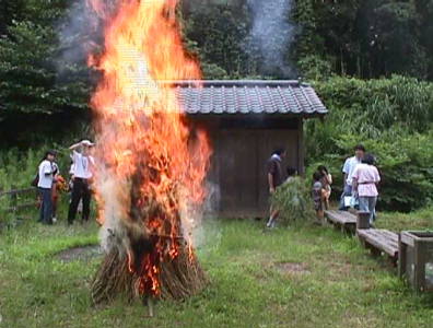 | 【稲に付く害虫を追い払う行事。村人が神社、寺などで法要を行った後、松明の火を焚きながら鉦を鳴らし、太鼓を叩き大声で唱えごとをしながら、幟を立てたり札を掲げて、行列を組み水田を巡り稲に付いた虫を集め村境まで送り出す。】 夏の夜、川のほとりに燃えあがる炎。燃えているのは麦ワラでおおわれたヤグラで、高さは5mをこえたものです。暗い夜の闇に浮きあがる炎の明るさに、引きこまれるかのように群がってくる虫たちが、「パチッパチッ」という音とともにやがて炎の中に消えていきます。まさに「飛んで火に入る夏の虫」です。 虫送りという名のこの行事は、夏をむかえて稲の生長とともに発生してくる虫を除く ことを目的としたもので、ほかにワラ人形を作って川に流したり焼いたりするものもあります。松明を燃やしたり、太鼓・鉦をたたいたり、呪文を唱えながら行列して虫を送る内容は、全国的にみられます。 |