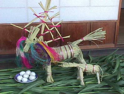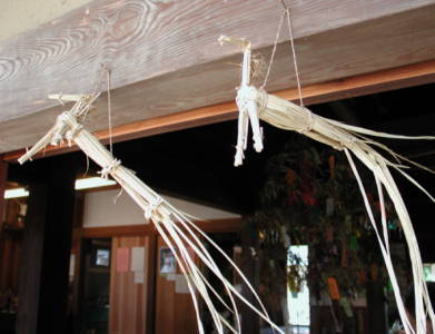| 七夕 【7月7日に牽牛星と織女星が天の川を渡って逢うという中国の伝説に基づく。日本では祖霊を迎えて行う盆の望の日の祭を神聖なものにするために、水の潔斎が行われていたことの名残とする説が強い。】 七夕は牽牛と織女が年に一度だけ会える日だといわれています。もし、この日が曇ってしまうとその年は会えなくなってしまうので、七夕の夜は星空であってほしいと私達は願います。しかし、この伝承は中国から伝わってきたもので、日本古来の行事ではありません。この話しが一般の人にも普及するようになったのは江戸時代も後半になってからで、意外と新しいことなのです。千葉県などでは、昭和の半ばまで、七夕が星の祭りだと考える人は少なく、違った形の行事が行われていました。 |