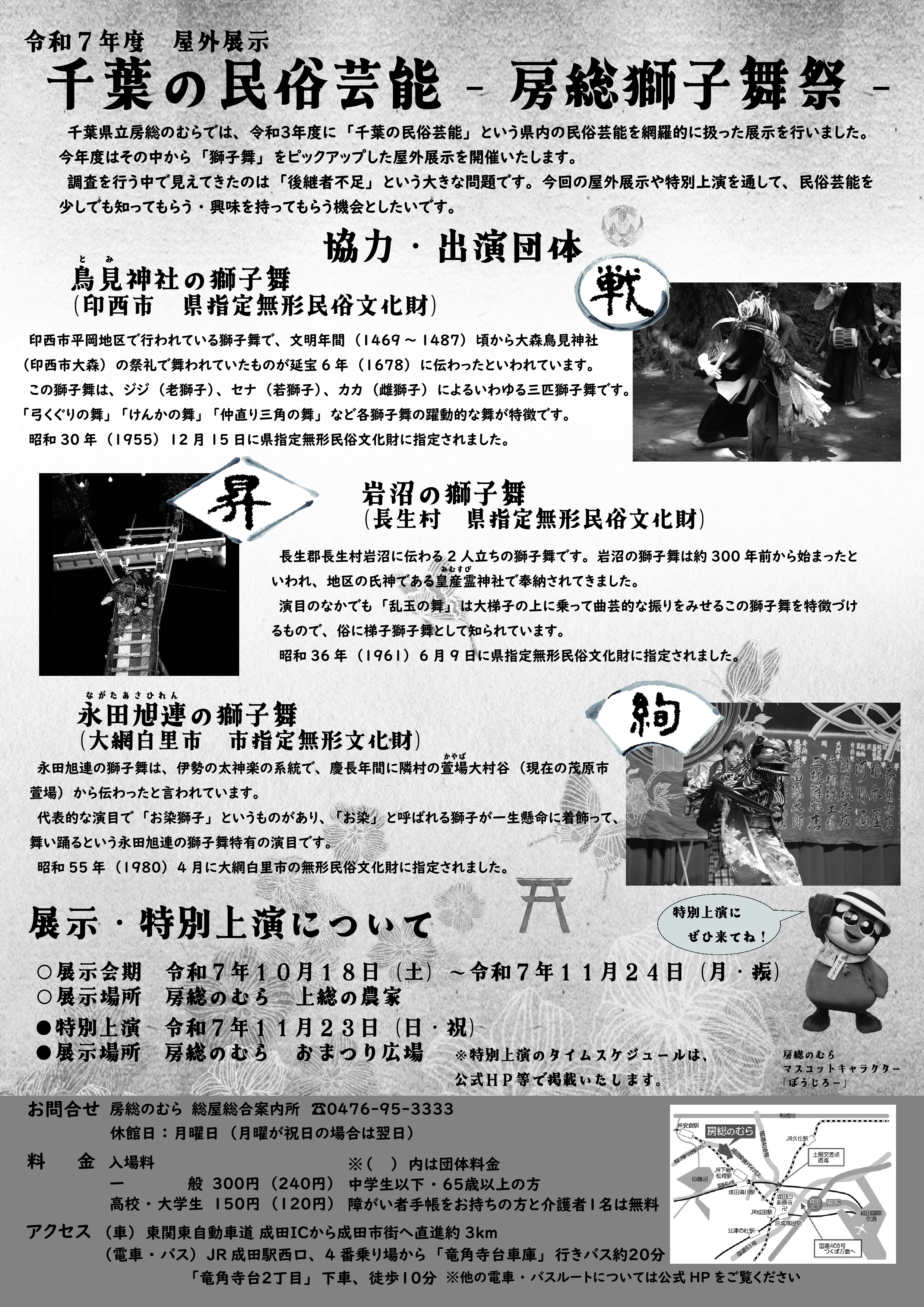 会 期 令和7年10月18日(土)~令和7年11月24日(月・振) 11月23日(日)には獅子舞の上演も予定しております。(会場 おまつり広場) ※詳細は後日掲載いたします。 開催時間 午前9時~午後4時30分 会 場 千葉県立房総のむら 上総の農家 入 場 料 一般 300円 高校・大学生 150円 ※中学生以下・65歳以上・障害者手帳をお持ちの方とその介助者1名は無料 休 館 日 月曜日(祝・休日の場合は翌日)