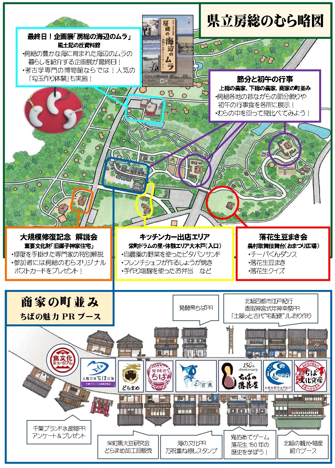 この節目を祝う記念事業のプレイベントとして、チーバくんたちと楽しむ落花生豆まき会や、国指定重要文化財「旧御子神家住宅」の修復記念解説会など、さまざまなイベントを開催します。