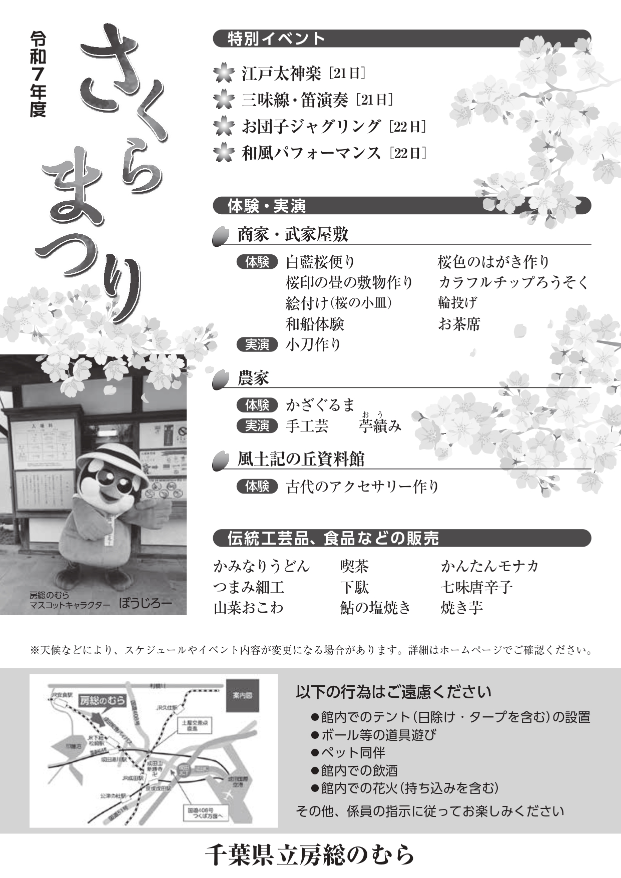 令和8年3月20日(金・祝)~22日(日)、24日(火)、25日(水)に「令和7年度 さくらまつり」を開催します。 「桜」に関する体験や実演をご用意して皆様をお待ちしております。 演目等の詳細は後日更新いたします。
