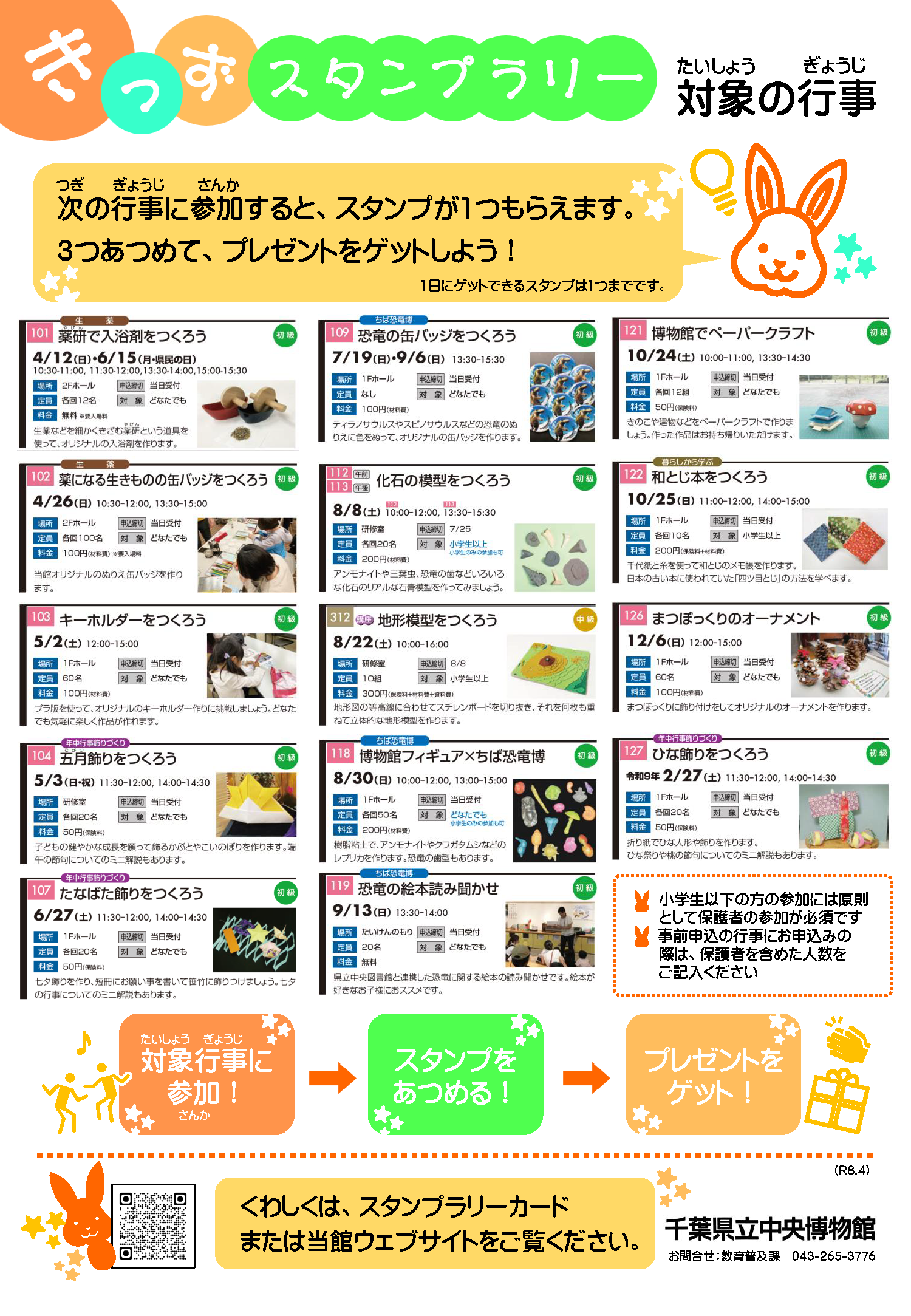 ・お子様とその保護者の方向けのスタンプラリーです。スタンプラリー対象の行事に1回参加すると、スタンプを1つ捺すことができます。対象の行事に3回参加してスタンプを3つ集めると、ステキなプレゼントをゲットできます。