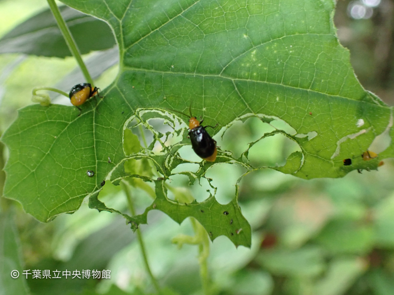 一覧にもどるススキ草地に生えているカラスウリの葉を食べていました。食べる前に円形または半円形に噛んで葉の維管束を切断し、その内側を食べます。これは「トレンチ行動」といい、植物が分泌する防衛物質を遮断するための習性だと考えられています。