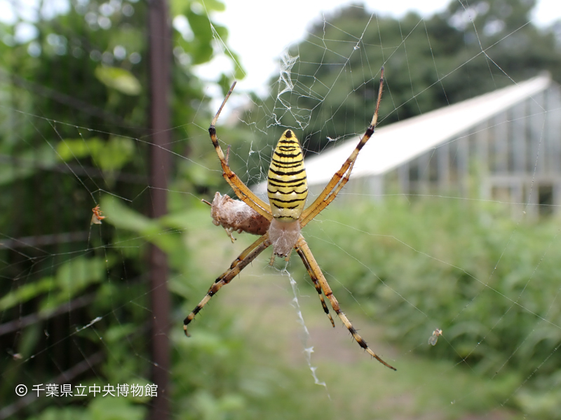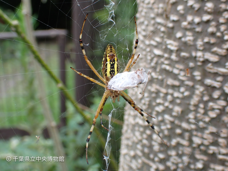 ススキ草地でよく見られるやや大型のクモです。糸でぐるぐる巻きにされた昆虫が網の中心にありました。