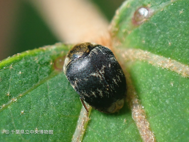 アカメガシワの葉にいた体長4ミリほどの甲虫です。葉の付け根付近にある花外蜜腺で吸蜜していました。カマキリタマゴカツオブシムシはカマキリの卵鞘に産卵し、幼虫はカマキリの卵や卵鞘を食べます。