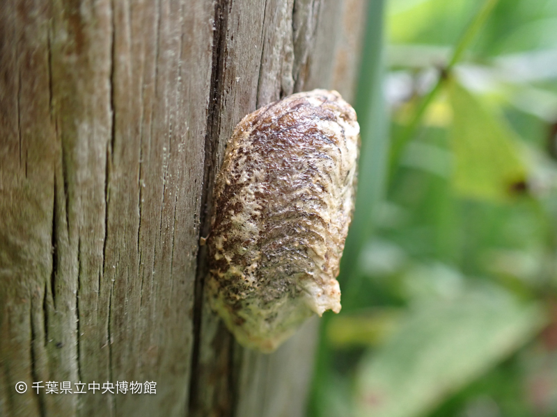 園路杭にハラビロカマキリの卵鞘が産みつけられていました。カマキリの産卵シーズンです。
