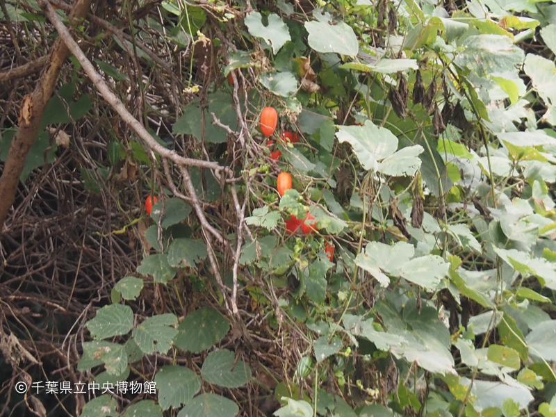 ススキ草地に面した林縁でカラスウリの実が鈴なりになっています。