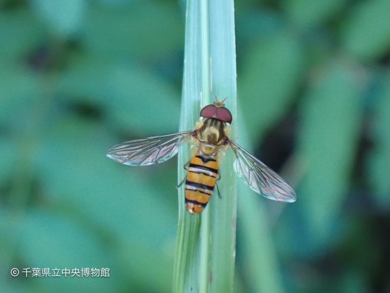 体長1センチほどのハナアブの仲間です。成虫は花粉や蜜を餌としますが、幼虫はアブラムシ類を捕食します。
