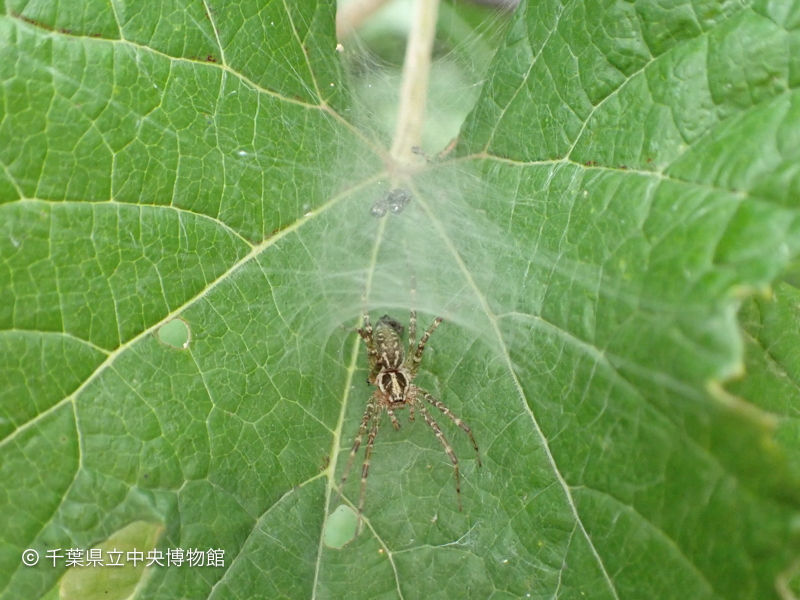 一覧にもどるエビヅルの葉上にいました。通常、このクモは風呂敷を拡げたようなシート状の網を張り、その一角に作ったトンネル状の巣の中にいて獲物がかかるのを待っています。この個体は葉の上にトンネル状の巣だけを作って、シート網を省略しているようです。