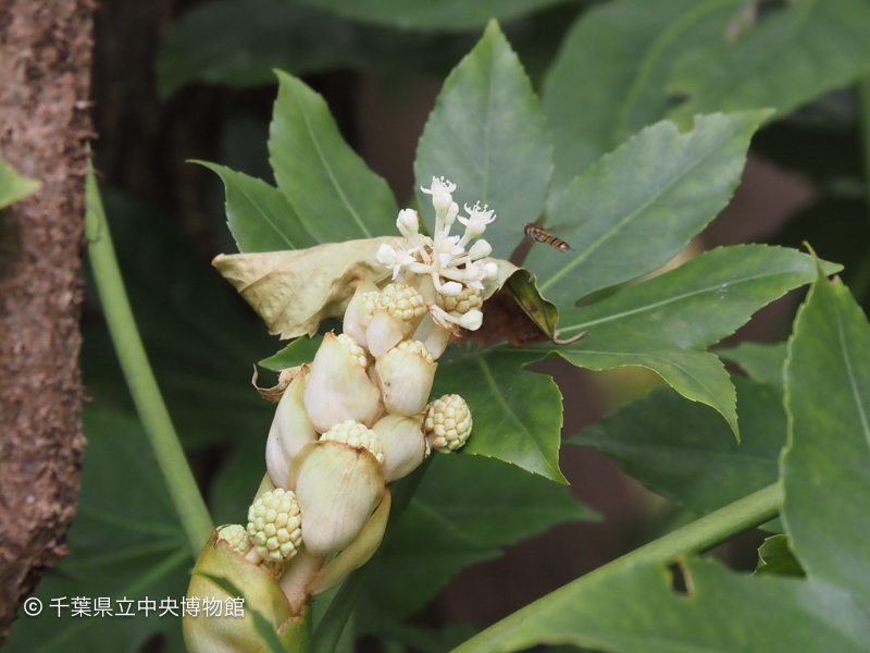 ヤツデの花が咲き始めました。さっそくホソヒラタアブが来ていました。
