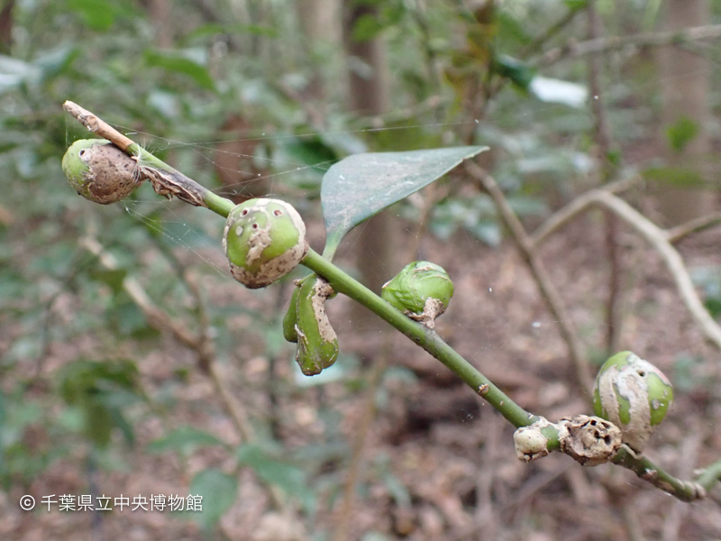 一覧にもどるタブ林に生えているモチノキの枝に丸っこい不定形の塊がいくつもついています。これはイヌツゲタマバエがモチノキの芽に寄生してできたモチノキメタマフシという名の虫こぶです。