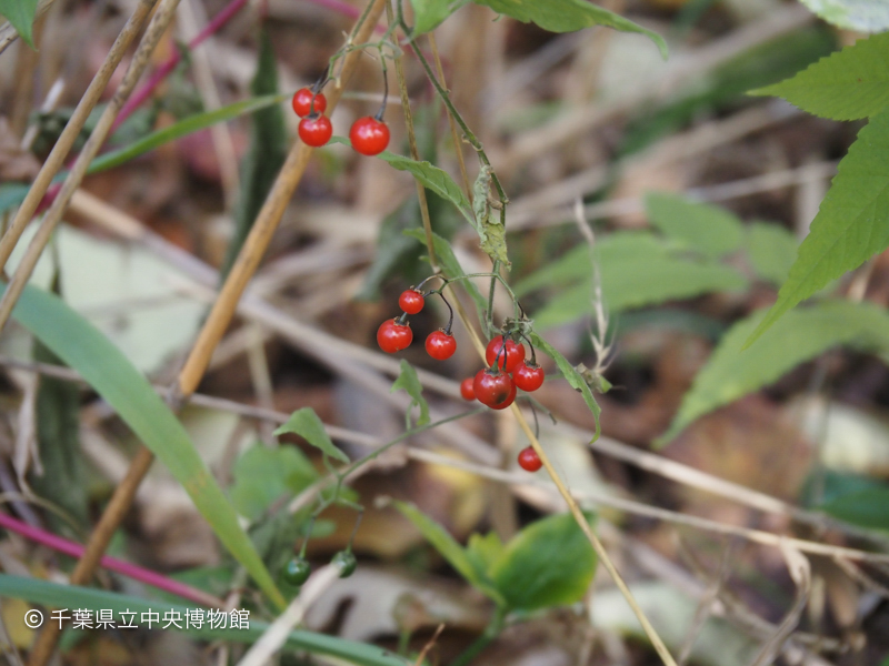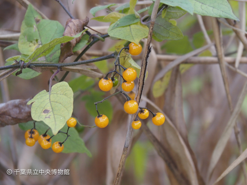 一覧にもどる舟田池畔のヨシ原にたくさん生えていました。今年は夏季に池の水位を下げたので、この場所で生育したものと思われます。果実が赤く熟すのが普通ですが、黄色く熟す品種キミノヒヨドリジョウゴもありました。