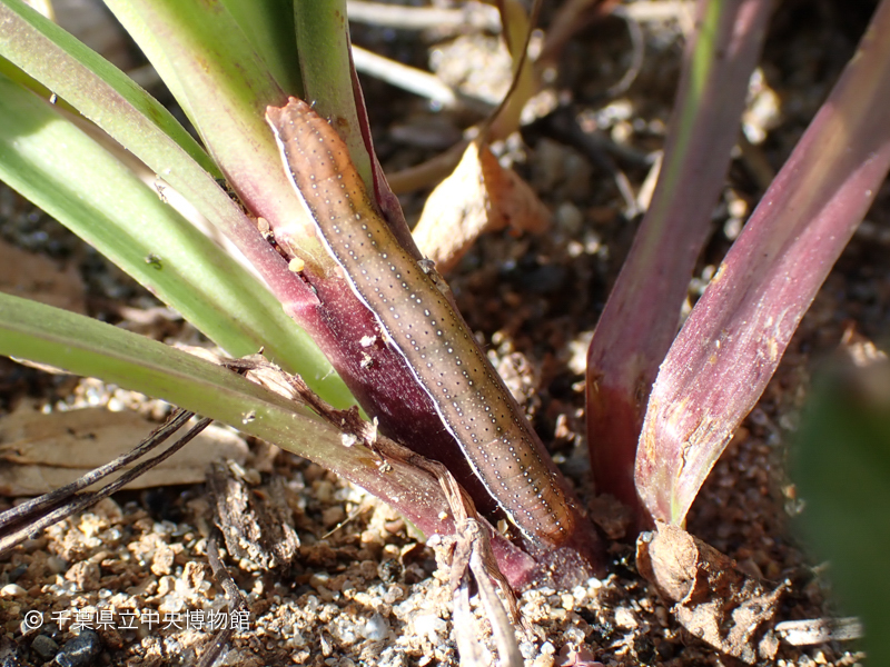 海岸植生に生えている草の根元にいました。いわゆる「夜盗虫(ヨトウムシ)」の一種、シロシタヨトウの幼虫だと思われます。