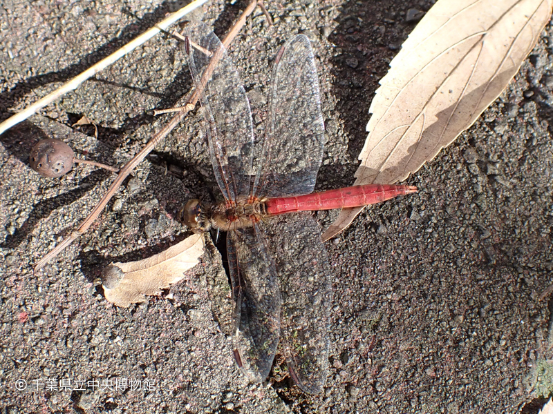 赤トンボが地面に落ちていました。まだわずかに動いていましたが、瀕死の様子。アキアカネの雄です。もうそろそろ成虫は姿を消す時期です。