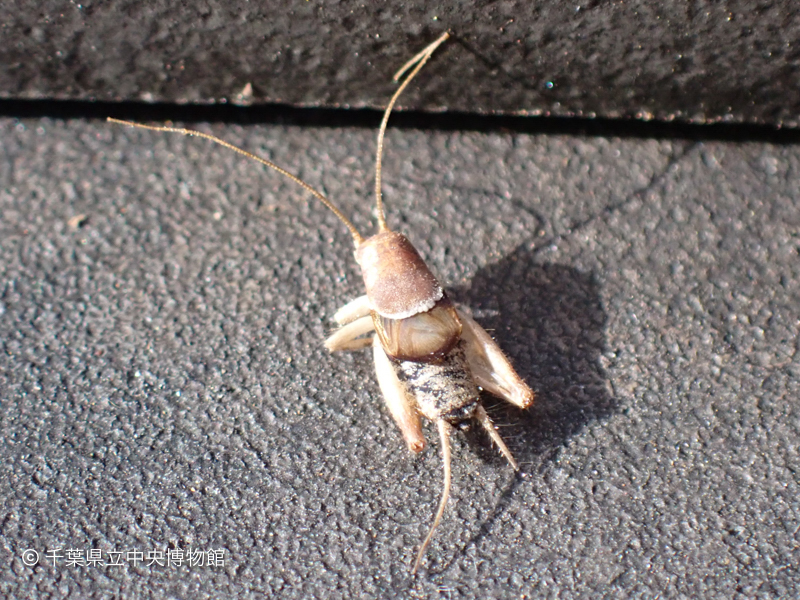 一覧にもどるイタリア橋の欄干にいました。カネタタキのオスです。体長は1センチほど。コオロギにやや近縁な昆虫で、オスは樹上で「チン、チン」と鳴きます。卵で越冬するので、成虫はそろそろ見納めでしょう。