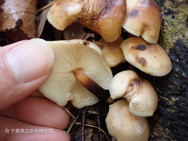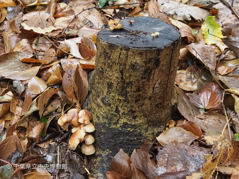 一覧にもどる常緑広葉樹林の園路付近にある切り株にキノコが発生していました。エノキタケです。市販のエノキタケとは見た目が違いますが、野生のエノキタケはこのような姿です。柄の下半部がつや消しの黒褐色である点が特徴です。さまざまな広葉樹の枯木に発生します。