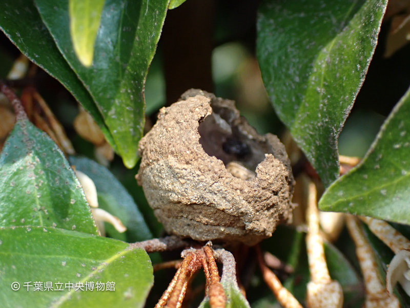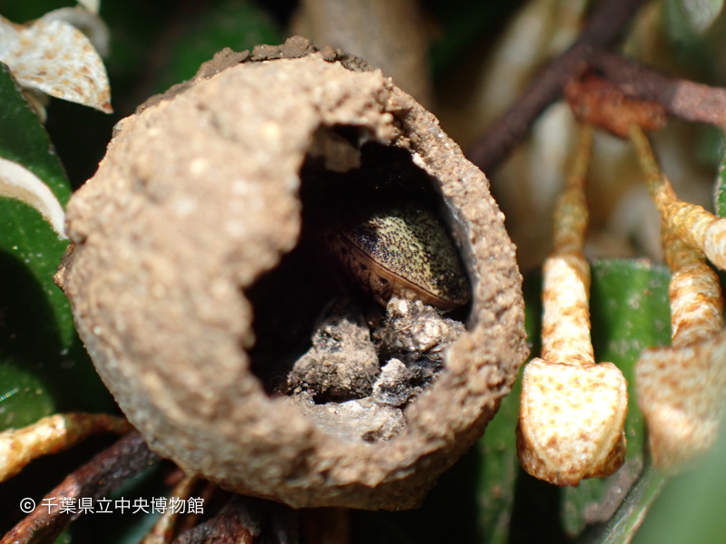 一覧にもどるツルグミの枝にトックリバチ類の巣がついていました。巣内で成長した幼虫が孵化した後の用済みの巣ですが、内部に何かがいました。よくよく見るとマルカメムシでした。よい越冬場所を見つけたものだと感心しました。