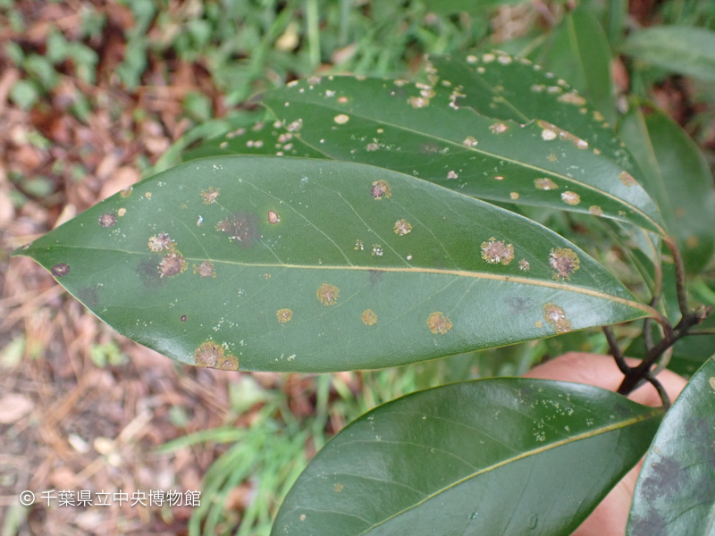 一覧にもどるタブノキの葉に直径数ミリの丸い斑点がいくつもありました。これはタブノキ白藻病(しろもびょう)と呼ばれるもので、病原体はスミレモ科の緑藻類です。拡大して見ると糸状体が二叉分枝しながら放射状に広がっているのがわかります。一部が枯死して白化している病斑もありました。