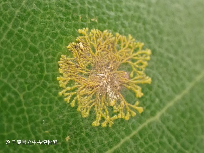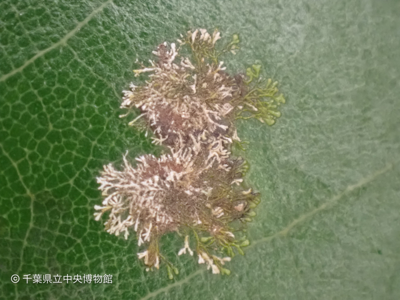 タブノキの葉に直径数ミリの丸い斑点がいくつもありました。これはタブノキ白藻病(しろもびょう)と呼ばれるもので、病原体はスミレモ科の緑藻類です。拡大して見ると糸状体が二叉分枝しながら放射状に広がっているのがわかります。一部が枯死して白化している病斑もありました。