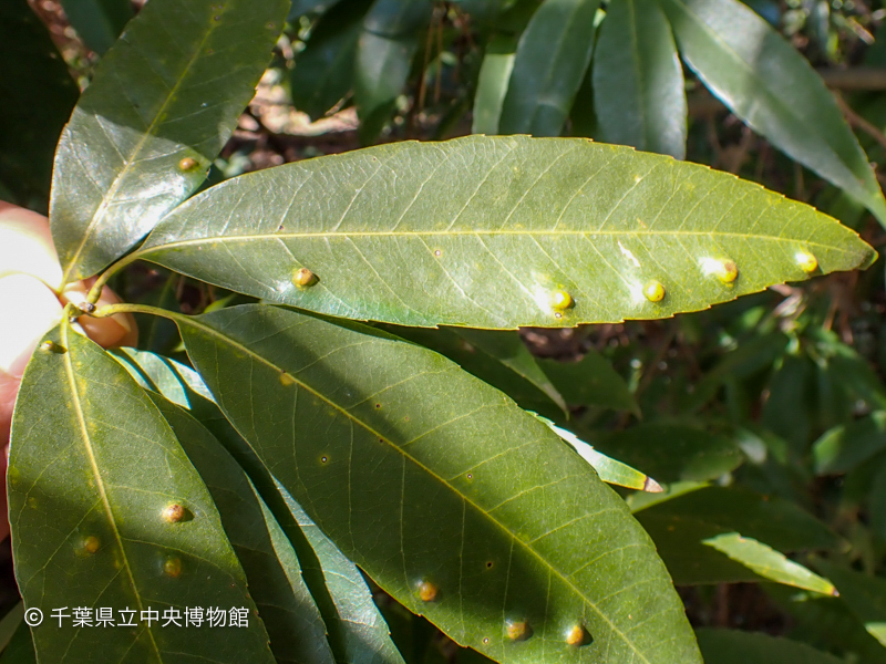 一覧にもどるシラカシの葉にできた虫こぶ。裏面は凹んで内側に褐色の毛が生えています。シラカシトガリキジラミの幼虫が寄生してできた虫こぶだと思われます。