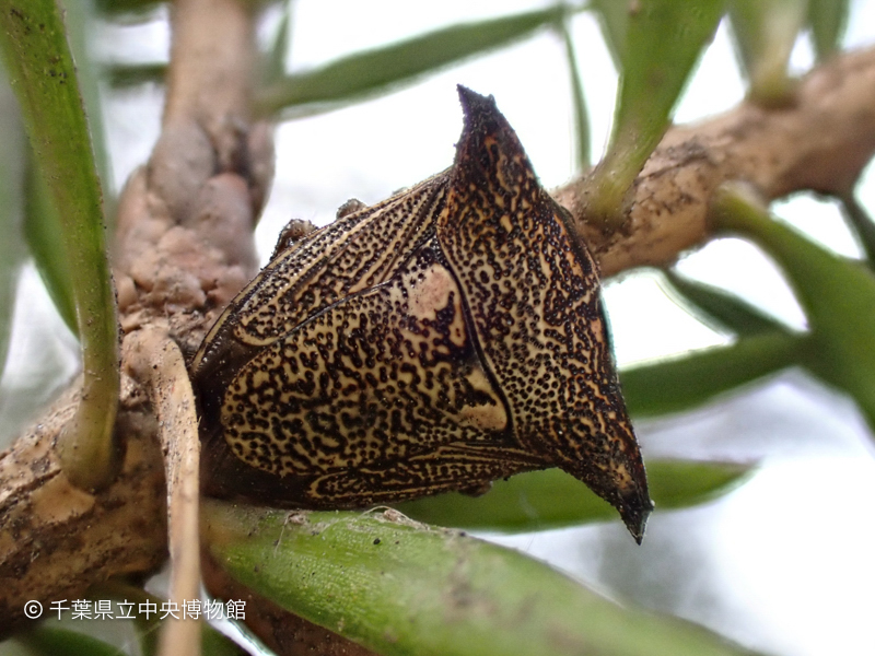 モミの枝にいました。越冬中のウシカメムシです。ウシの角のように突出した前胸の側角が格好良いです。