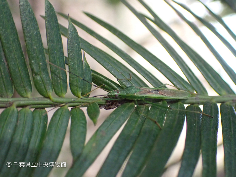 イヌガヤの枝にとまっていました。越冬中のクモヘリカメムシです。ここにじっとしていると細長い緑色の身体は目立たないことをわかっているのでしょうか。