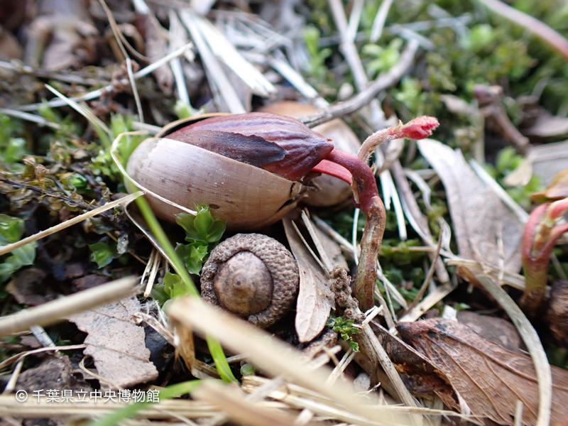 コナラのどんぐりが割れて子葉が現れ、2枚の子葉の間から茎と本葉が伸び始めています。