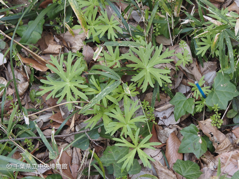 せせらぎ脇に生えているツクバトリカブトの葉が展開しました。