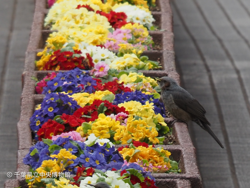 一覧にもどるイタリア橋の花壇にヒヨドリがとまってプリムラの花をついばんでいました。くちばしに黄色い花びらが挟まっています。この花壇の花は半分くらいぼろぼろになっていました。