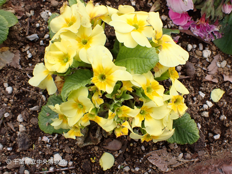 イタリア橋の花壇にヒヨドリがとまってプリムラの花をついばんでいました。くちばしに黄色い花びらが挟まっています。この花壇の花は半分くらいぼろぼろになっていました。