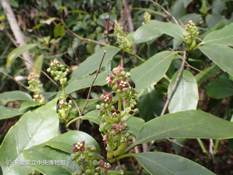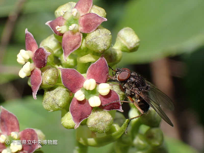 アオキの花が咲き始めました。アオキは雌雄別株で、この個体は雄株です。花に止まっているハエはハナバエの一種だと思われます。