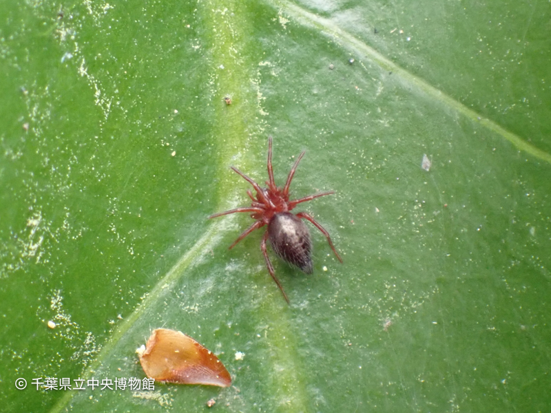 アオキの葉の上でクサグモの幼体が巣作りを始めていました。体長3ミリほどです。