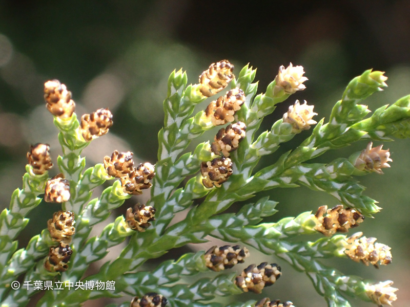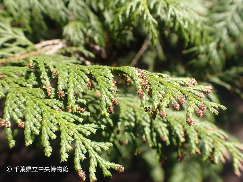 オリエンテーションハウス向かいに生えているサワラの雄花が咲いて、花粉が見えています。