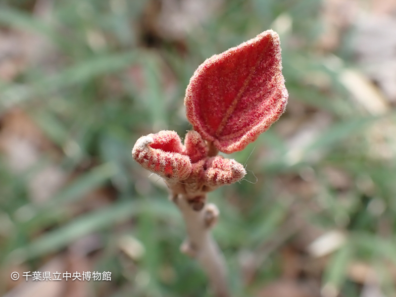 アカメガシワの枝先で新葉が展開し始めています。「赤芽柏」の名の元となった真っ赤な新葉です。この赤色は葉の表面に生えた毛の色で、毛に隠れている葉身は緑色です。