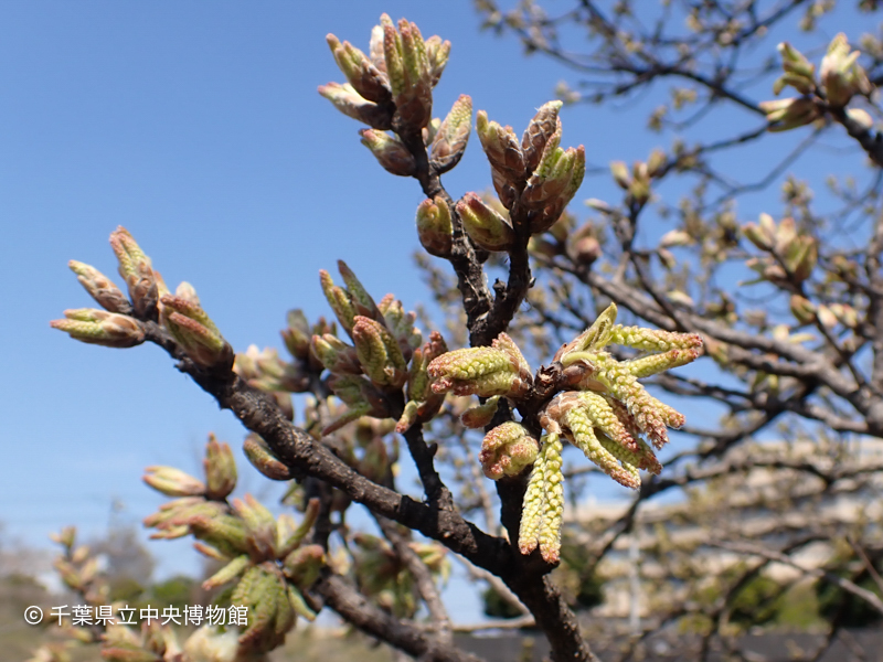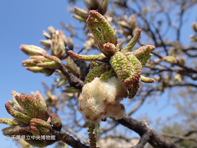 クヌギの冬芽が開いて雄花序が伸び始めています。花序の下に見える綿のようなものはクヌギハナカイメンフシという虫こぶです。クヌギハケタマバチというハチの一種が冬芽に産卵してできたもので、このハチは夏にはクヌギの葉に別の虫こぶを作ります。詳しくはこちらの記事をごらんください。