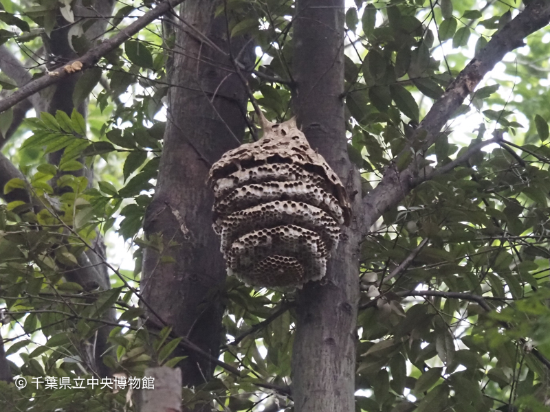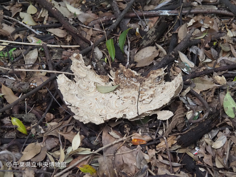 昨年、スダジイ林内に作られたキイロスズメバチの巣が壊れていました。もう空き家ですが、3/31に千葉測候所で最大瞬間風速27m/sを記録した猛烈な強風の影響だと考えられます。少し離れた地表には巣の外被の破片が落下していました。