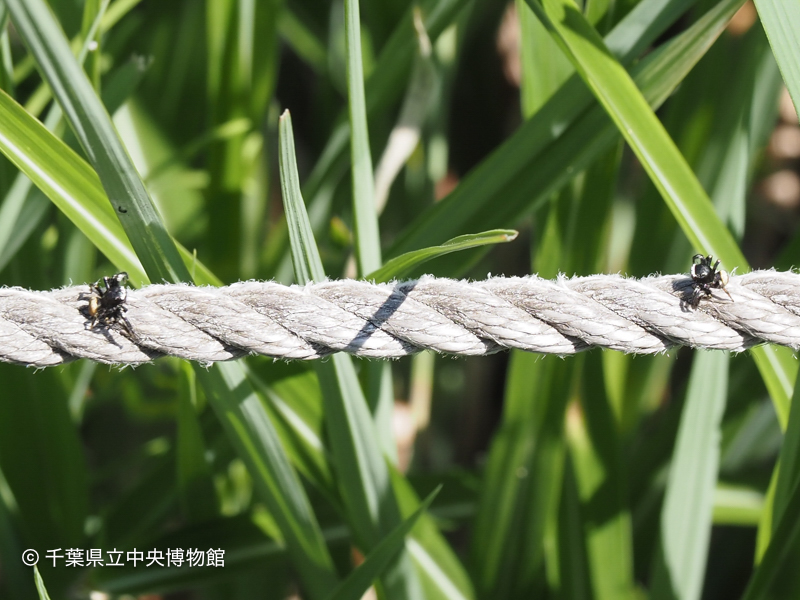 ススキ草地の園路ロープにマミジロハエトリの雄がいました。2匹の雄が向かい合ってファイティングポーズをとっていました。