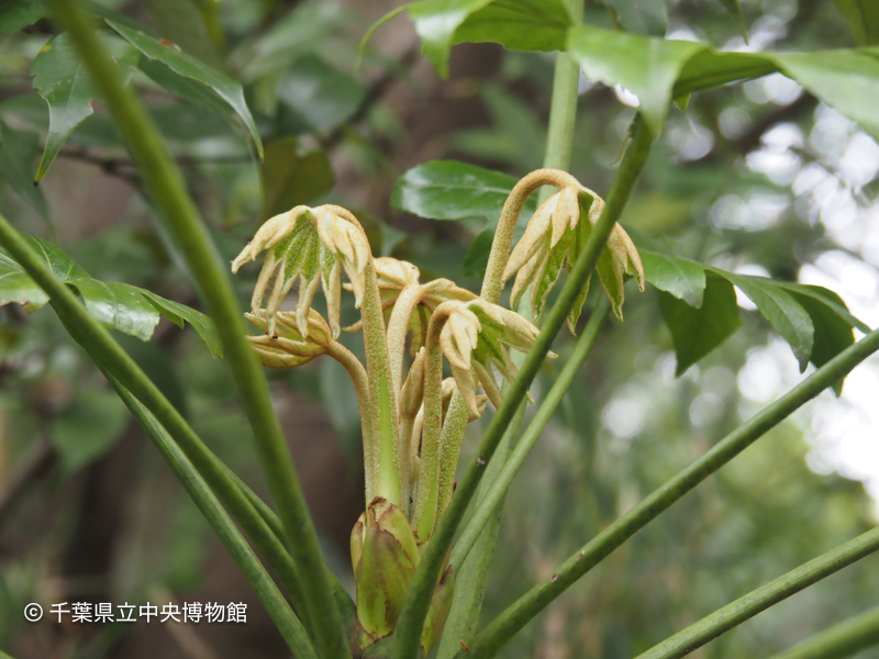 ヤツデの新葉が展開し始めました。すぼめた手のような独特の形が面白いと思います。